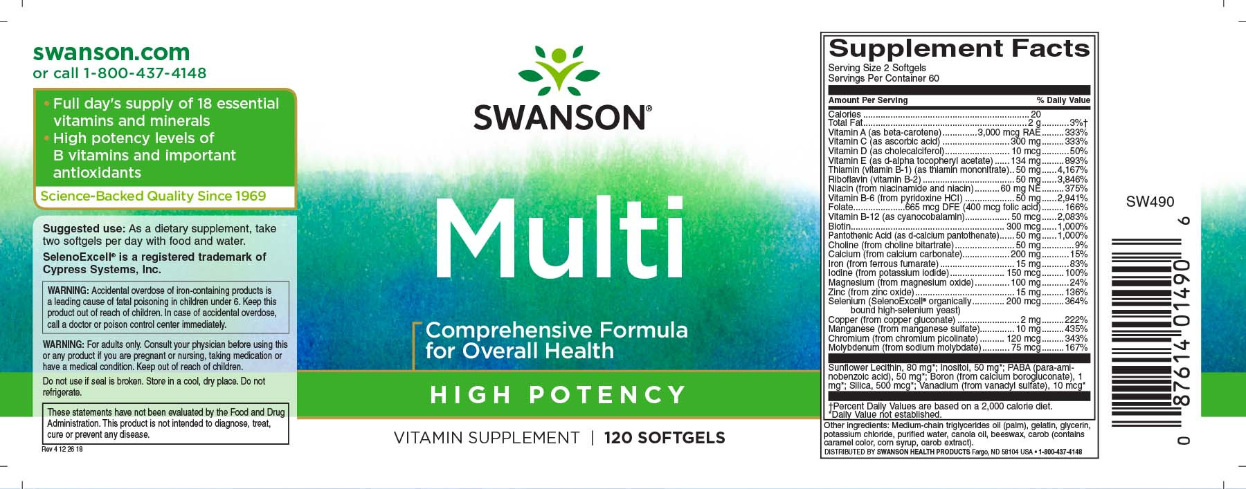 Vysoko účinné multi softgelové kapsule Swanson obsahujúce vitamíny a minerály.
