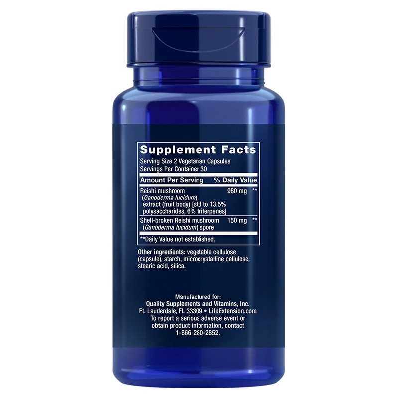 | Extrakt z huby Reishi (Ganoderma lucidum) (ovocné telo) [štandardne 13,5 % polysacharidov (132,3 mg) a 6 % triterpénov (58,8 mg)] | 980 mg | |